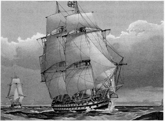This list was magnificently displayed, painted on silver ovals with wreaths around them, in a very 1950's style wholly appropriate to the design of the hall. It appears to have been researched by someone with a keen interest in the Napoleonic and French Revolutionary Wars, but little knowledge of the "official" actions, which are based on the campaign bars attached to the Naval General Service medal 1794-1840, which was awarded retrospectively by Queen Victoria in 1848 to the elderly survivors of the French Wars, and various later actions, including Syria 1840. The actions off Brest and Finisterre were deemed unimportant at that time, though HMS THUNDERER was certainly present, as she was at the failed attempt to force the passage of the Dardanelles in 1806, which disaster was similarly not commemorated officially. The other differences are more interesting, and bring us on to the story of the earliest of the Thunderers. THE WOODEN BATTLESHIPSThe first to carry the name was a 74-gun "3rd Rate" battleship of 1,600 tons, launched at Woolwich in 1760. She was involved in a single-ship action with the French Achille in the following year, but foundered in the great hurricane in the West Indies in 1780. However, it was not this vessel that earned the Battle honour Lake Champlain, 1776, but a small 14-gun ketch carrying the same name, which operated on the Canadian Lakes during the American War of Independence. Little is known of this minor war-vessel, but it is a pity that the recognised battle-honour she earned fighting the Americans has never been displayed in Manadon or Keyham, or even acknowledged there. Perhaps if there is to be a new THUNDERER, this omission can be rectified one day.