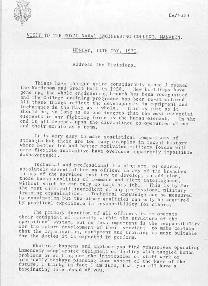HRH Visit - Monday 11 May 1970 Text of HRH The Duke of Edinburgh's Address to the Divisions