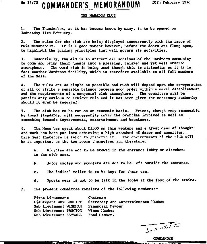 The Opening of the Thunderbox - Commanders Memorandum The Commander's Memorandum, signed by Cdr Robertson, that marked the grand opening of the RNEC Thunderbox 10 February, 1970